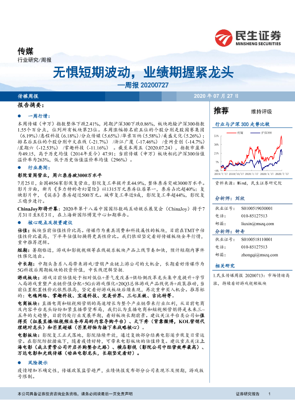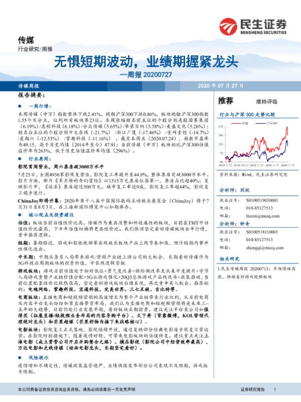 【民生证券】【20200727】20200727-民生证券-传媒周报:无惧短期波动,业绩期握紧龙头-16页