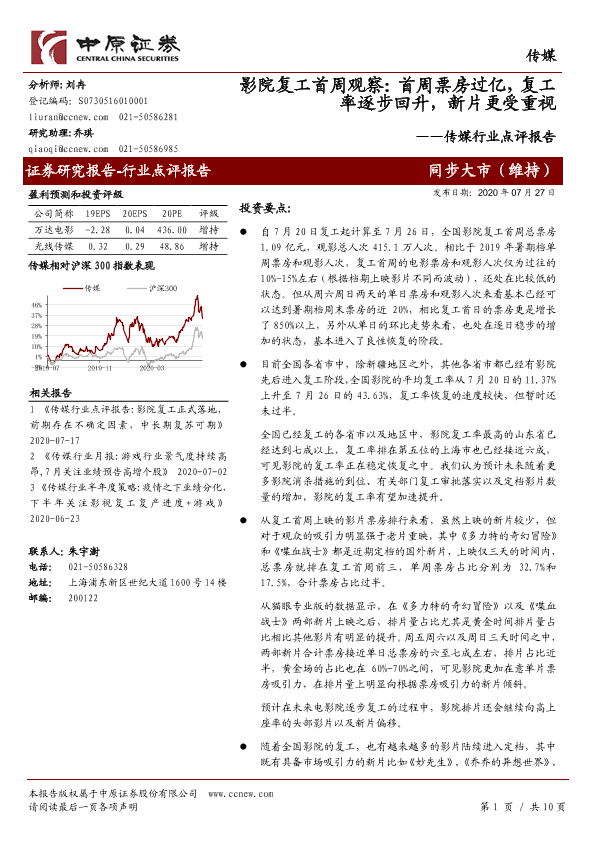 【中原证券】【20200727】影院复工首周观察:首周票房过亿,复工率逐步回升,新片更受重视-10页
