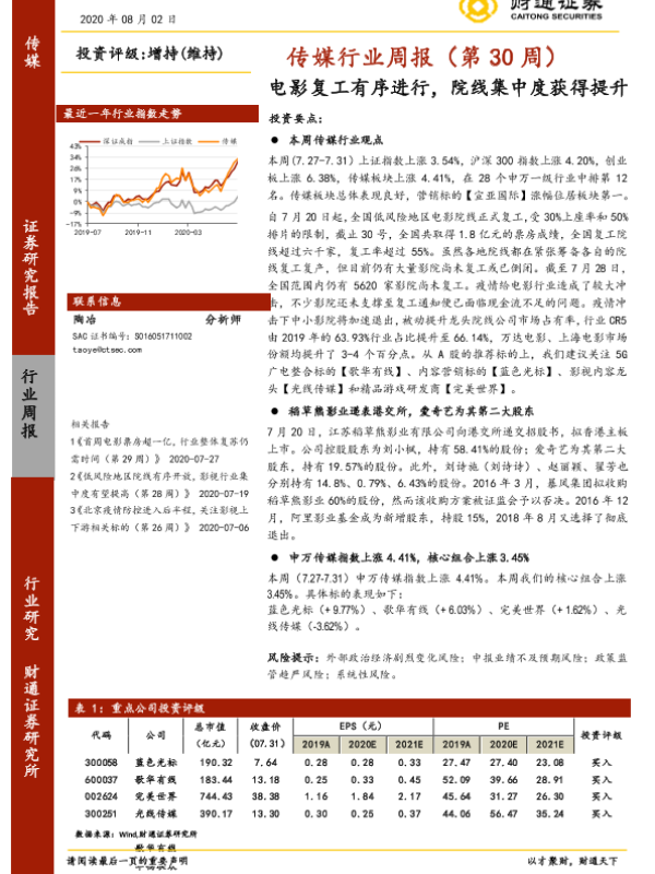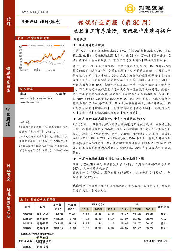 【财通证券】【20200802】20200802-财通证券-传媒行业周报(第30周):电影复工有序进行,院线集中度获得提升-17页