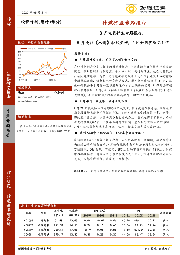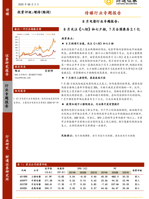 【财通证券】【20200802】8月电影行业专题报告:8月关注《八佰》和七夕档,7月全国票房2.1亿-10页