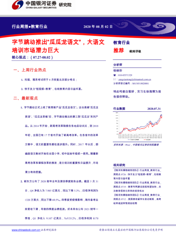 【银河证券】【20200802】教育行业周报:字节跳动推出“瓜瓜龙语文”,大语文培训市场潜力巨大-23页