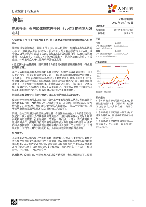 【天风证券】【20200803】20200803-天风证券-传媒行业点评:电影行业:票房加速复苏进行时,《八佰》定档注入强心剂-2页