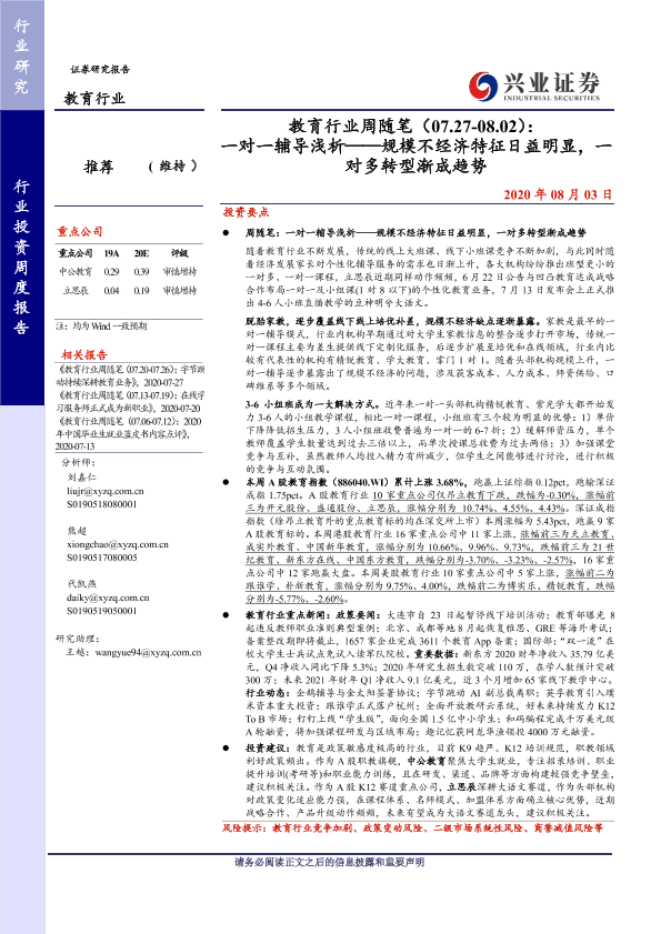 【兴业证券】【20200803】教育行业周随笔(07.27-08.02):一对一辅导浅析——规模不经济特征日益明显,一对多转型渐成趋势-18页