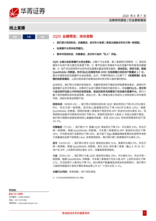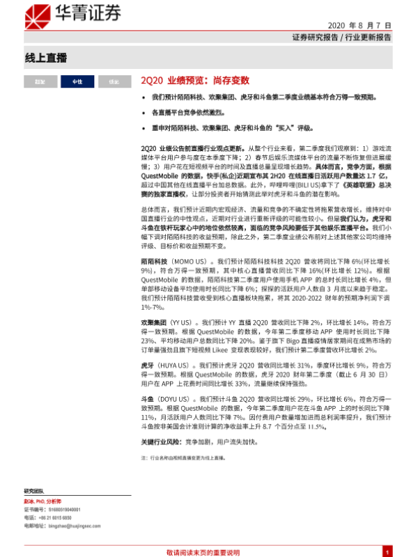 【华兴证券】【20200807】2Q20业绩预览:尚存变数-4页