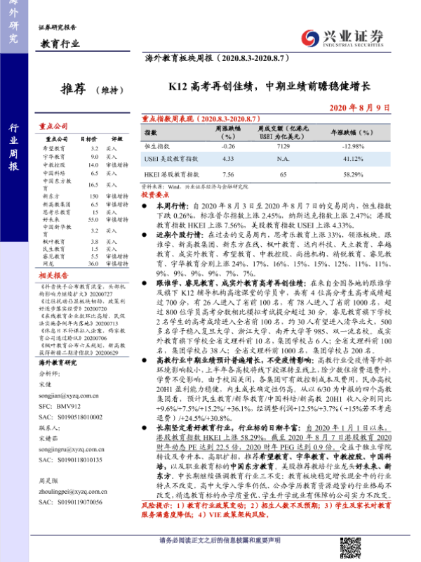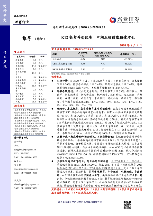 【兴业证券】【20200809】海外教育板块周报:K12高考再创佳绩,中期业绩前瞻稳健增长-13页