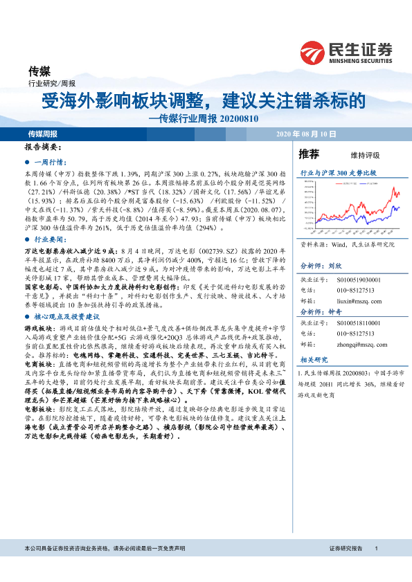 【民生证券】【20200810】20200810-民生证券-传媒行业周报:受海外影响板块调整,建议关注错杀标的-16页