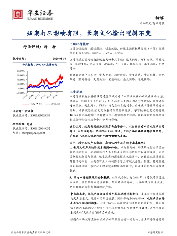 【华安证券】【20200810】20200810-华安证券-传媒行业周报:短期打压影响有限,长期文化输出逻辑不变-15页