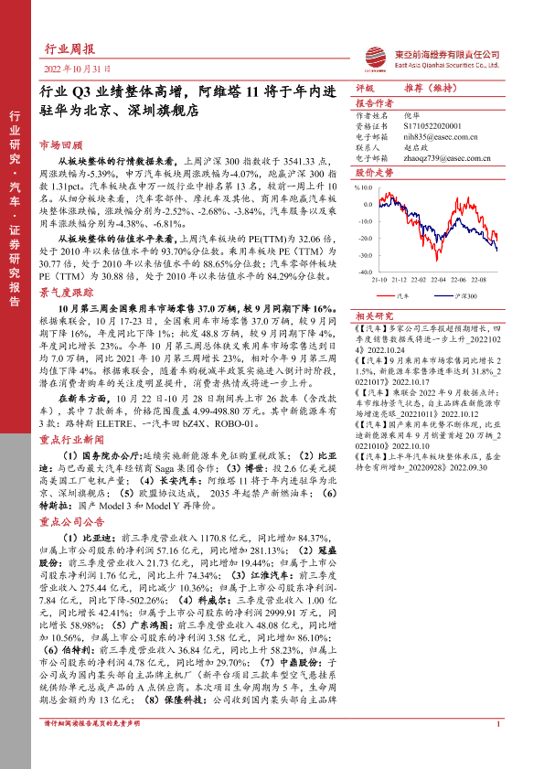 【东亚前海证券】【20221031】汽车行业周报:行业Q3业绩整体高增,阿维塔11将于年内进驻华为北京、深圳旗舰店-21页