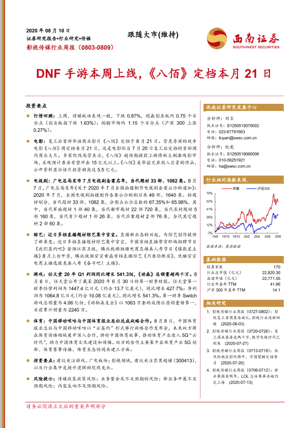 【西南证券】【20200810】20200810-西南证券-影视传媒行业周报:DNF手游本周上线,《八佰》定档本月21日-21页