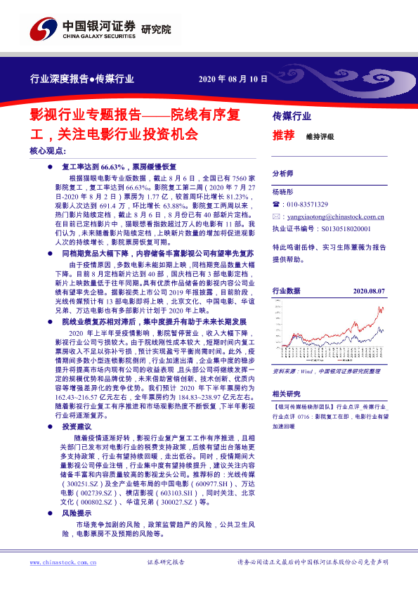 【银河证券】【20200810】影视行业专题报告:院线有序复工,关注电影行业投资机会-42页