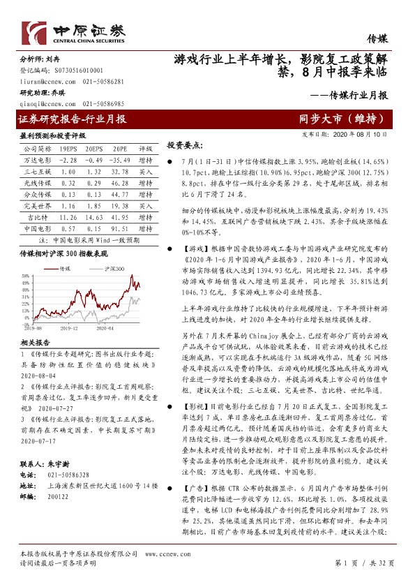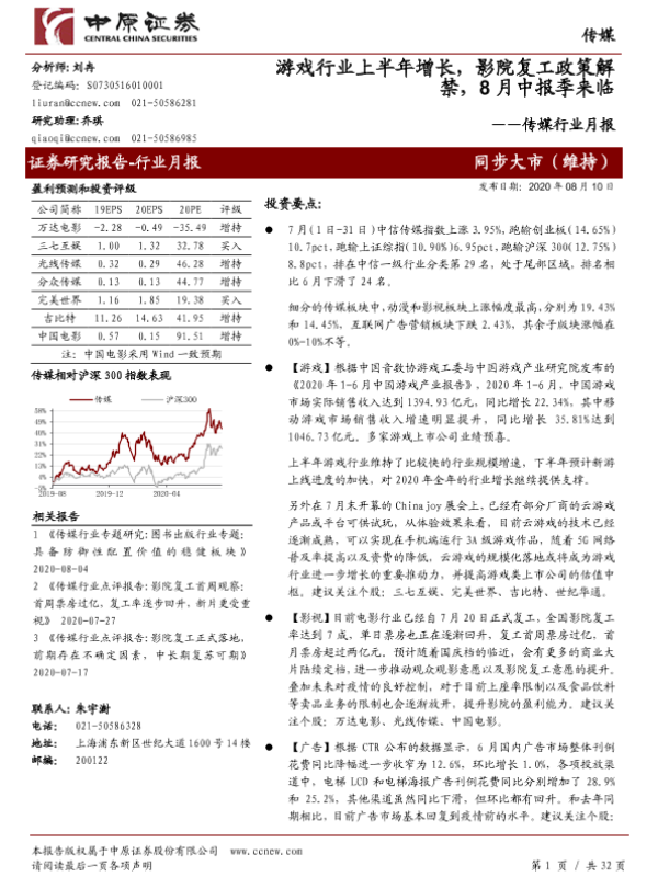 【中原证券】【20200810】20200810-中原证券-传媒行业月报:游戏行业上半年增长,影院复工政策解禁,8月中报季来临-32页