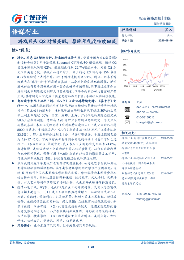 【广发证券】【20200816】20200816-广发证券-传媒行业投资策略周报:游戏巨头Q2财报亮眼,影院景气度持续回暖-23页