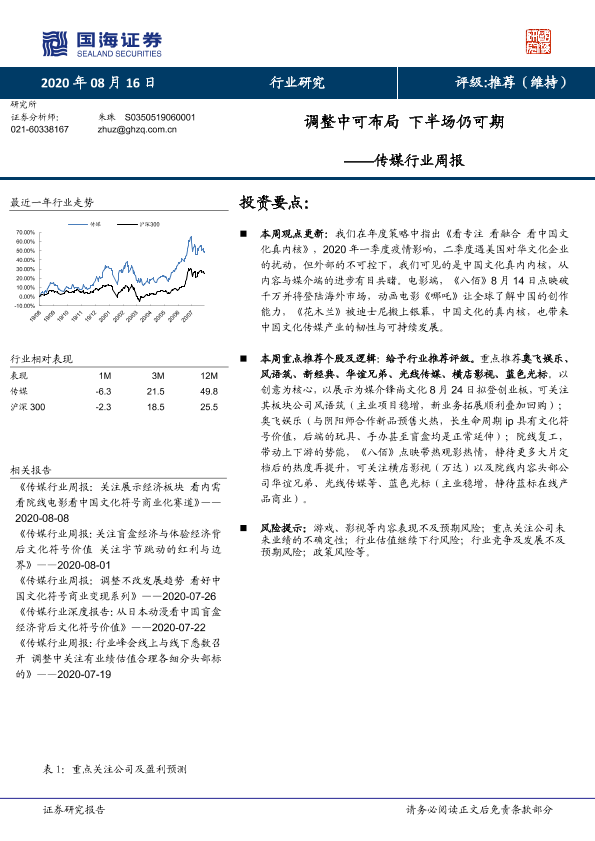 【国海证券】【20200816】传媒行业周报:调整中可布局 下半场仍可期-19页