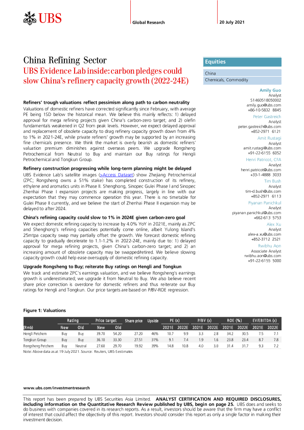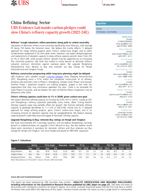 【UBS Securities Asia Limited】【20210720】瑞银-中国炼油行业-碳承诺可能减缓中国炼油厂产能增长-36页