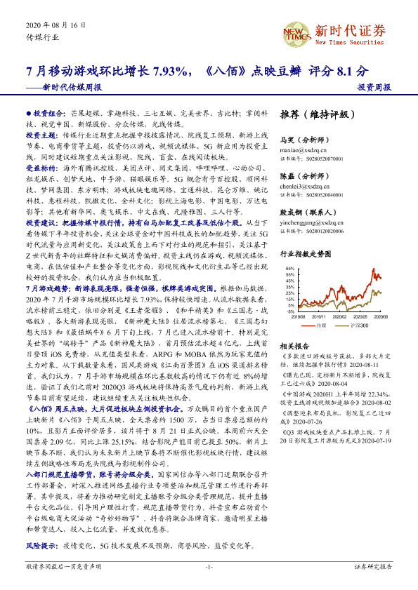 【新时代证券】【20200816】新时代传媒周报:7月移动游戏环比增长7.93%,《八佰》点映豆瓣评分8.1分-36页
