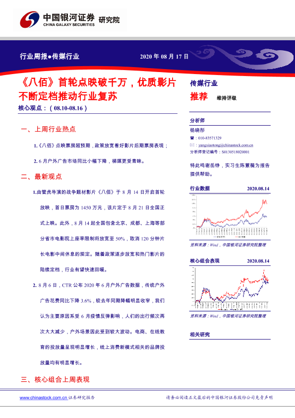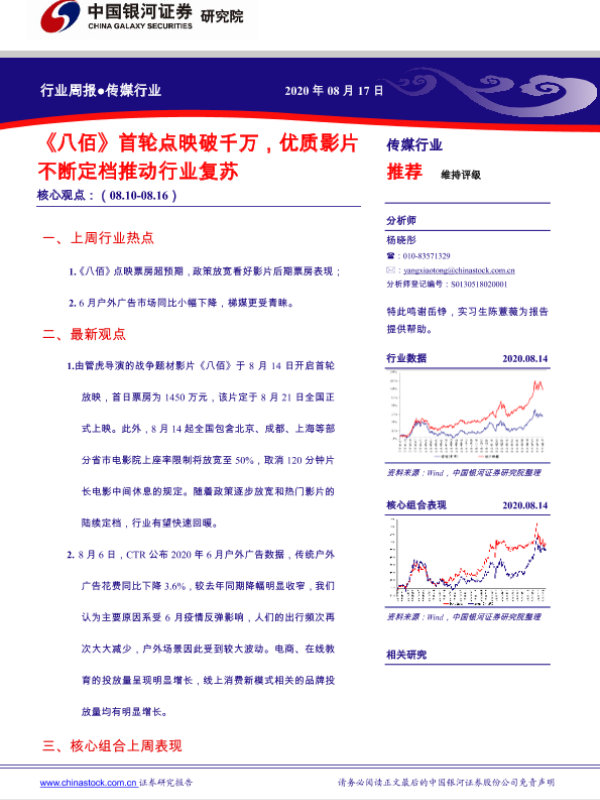 【银河证券】【20200817】20200817-中国银河-传媒行业周报:《八佰》首轮点映破千万,优质影片不断定档推动行业复苏-54页