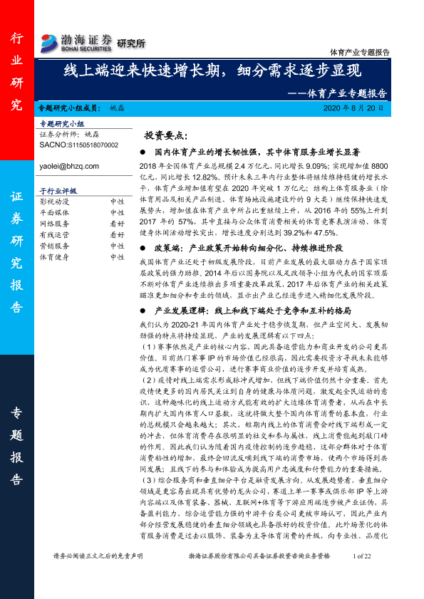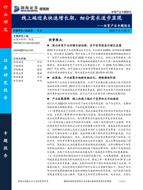 【渤海证券】【20200820】体育产业专题报告:线上端迎来快速增长期,细分需求逐步显现-22页