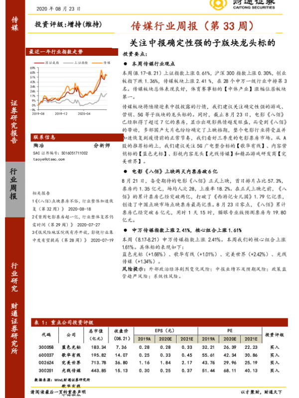 【财通证券】【20200823】20200823-财通证券-传媒行业周报(第33周):关注中报确定性强的子版块龙头标的-17页