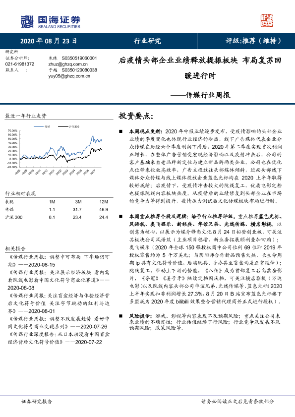 【国海证券】【20200823】传媒行业周报:后疫情头部企业业绩释放提振板块 布局复苏回暖进行时-19页