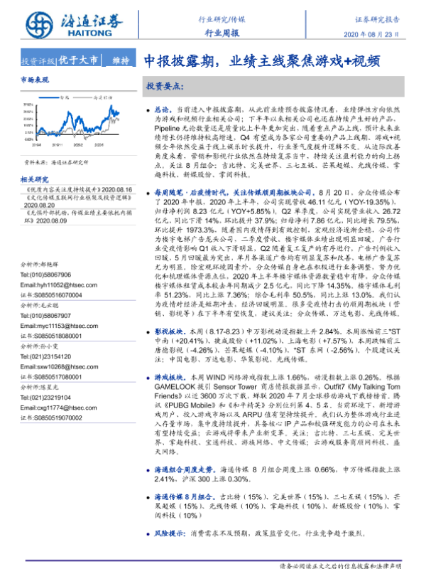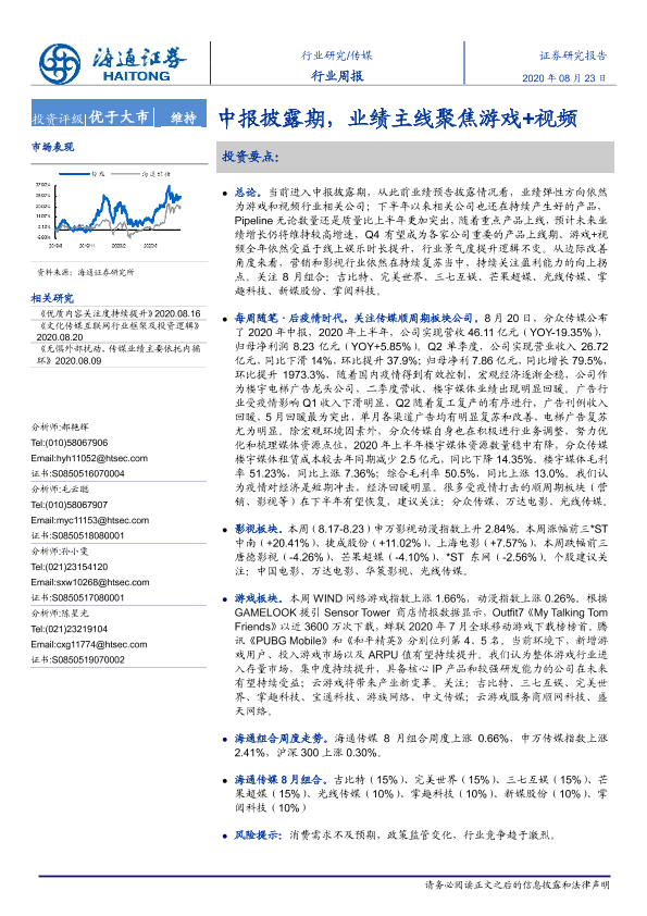 【海通证券】【20200823】20200823-海通证券-传媒行业周报:中报披露期,业绩主线聚焦游戏+视频-10页