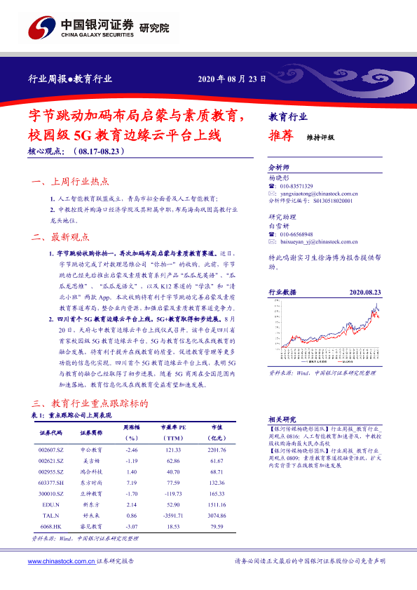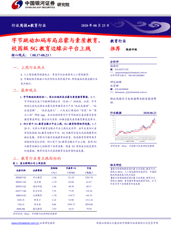 【银河证券】【20200823】20200823-中国银河-教育行业周报:字节跳动加码布局启蒙与素质教育,校园级5G教育边缘云平台上线-17页