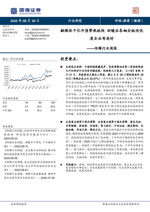 【国海证券】【20200830】20200830-国海证券-传媒行业周报:融媒体千亿市值带热板块 回暖后各细分板块优质企业布局时-19页