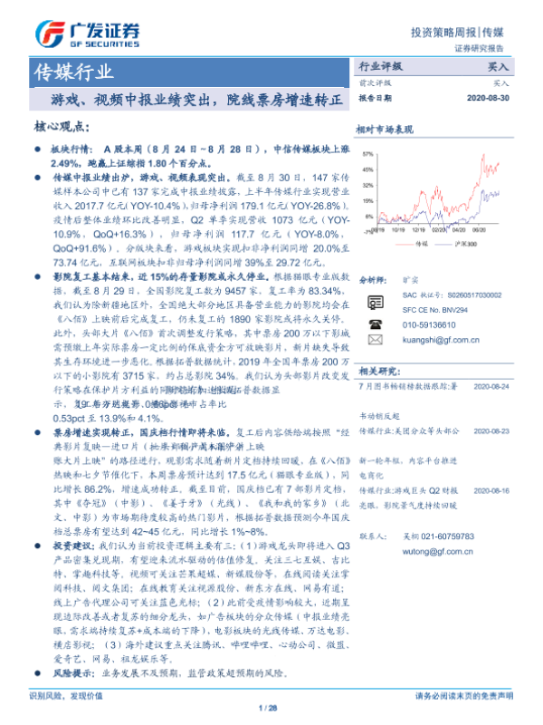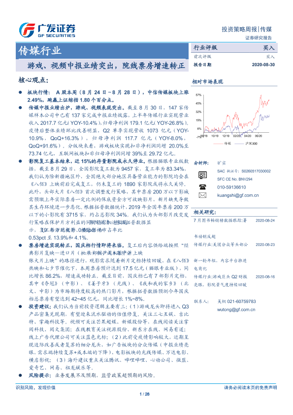 【广发证券】【20200830】20200830-广发证券-传媒行业投资策略周报:游戏、视频中报业绩突出,院线票房增速转正-28页