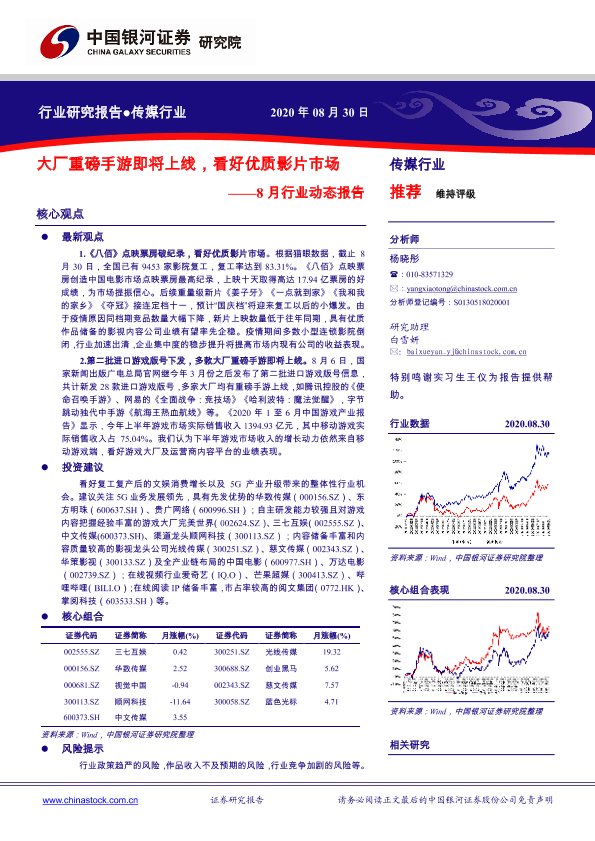 【银河证券】【20200830】20200830-中国银河-传媒8月行业动态报告:大厂重磅手游即将上线,看好优质影片市场-73页