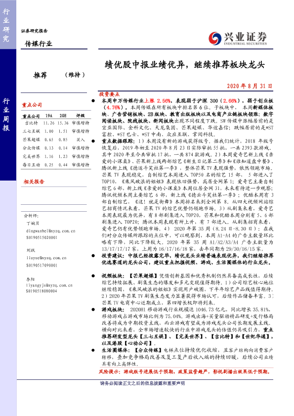 【兴业证券】【20200831】20200831-兴业证券-传媒行业周报:绩优股中报业绩优异,继续推荐板块龙头-16页