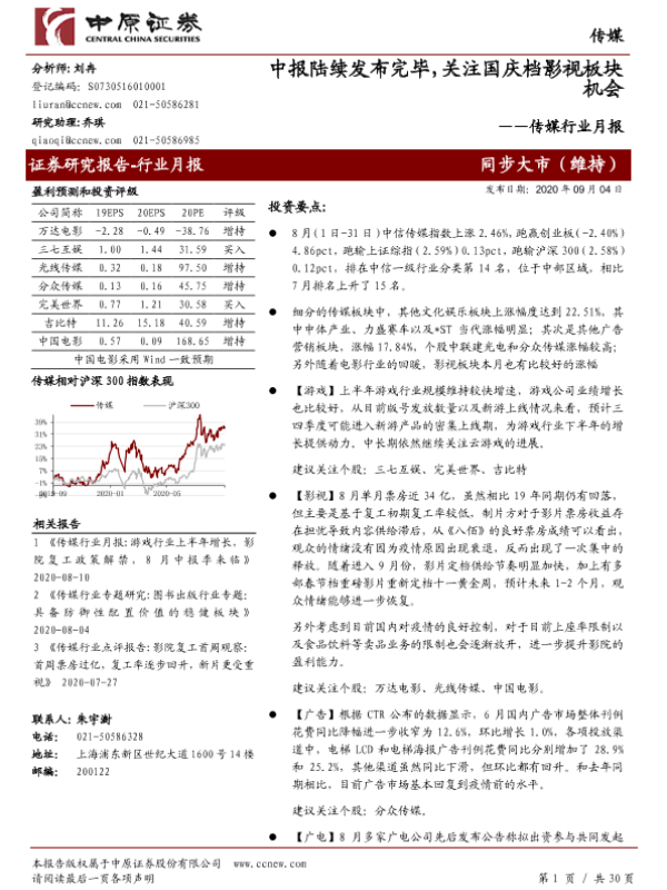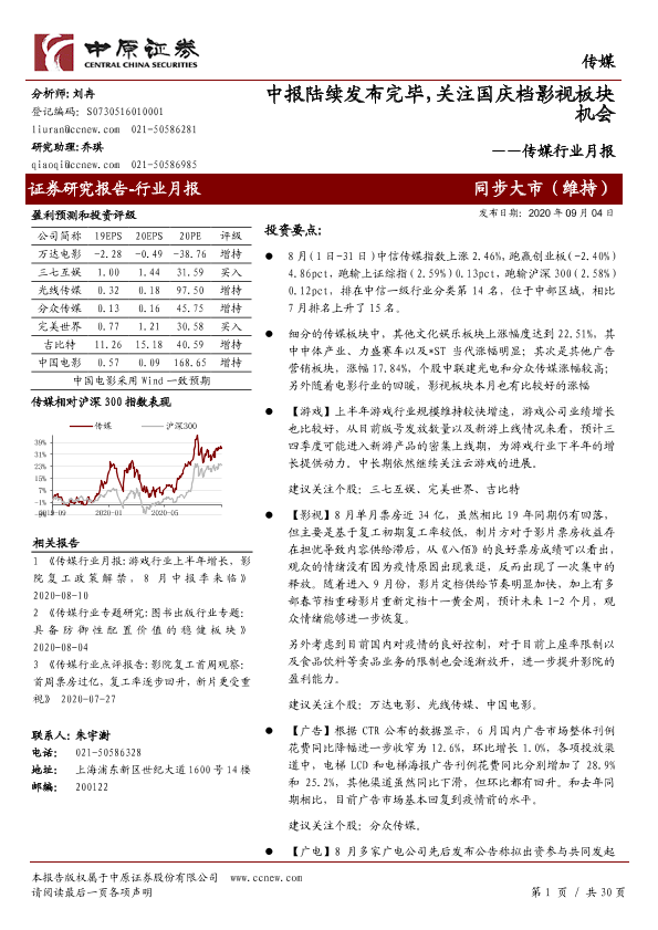 【中原证券】【20200904】20200904-中原证券-传媒行业月报:中报陆续发布完毕,关注国庆档影视板块机会-30页