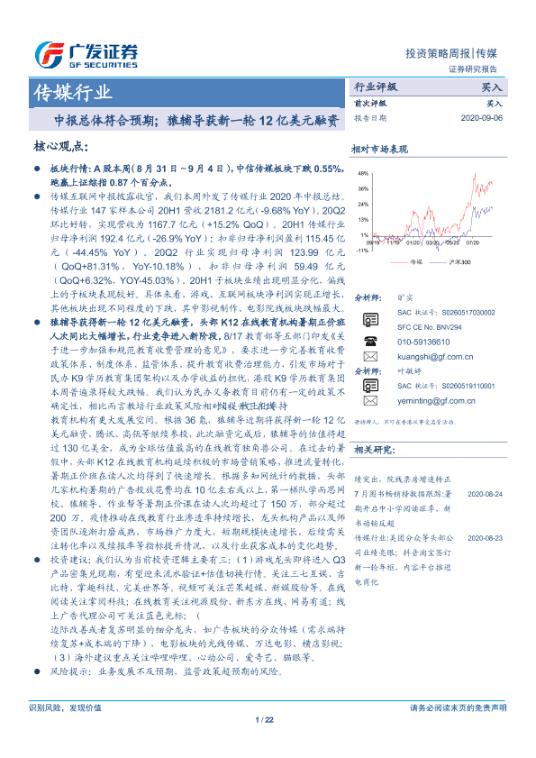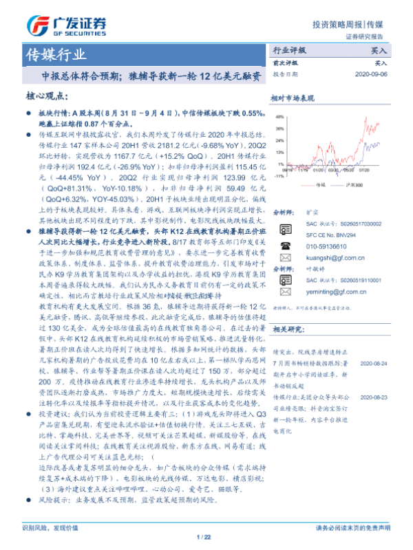 【广发证券】【20200906】20200906-广发证券-传媒行业投资策略周报:中报总体符合预期;猿辅导获新一轮12亿美元融资-22页