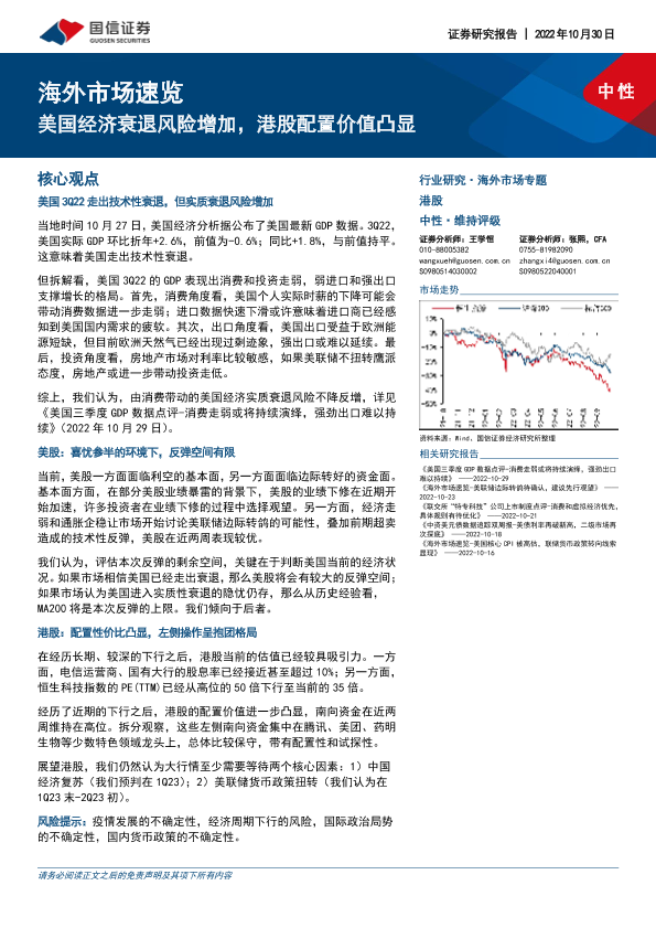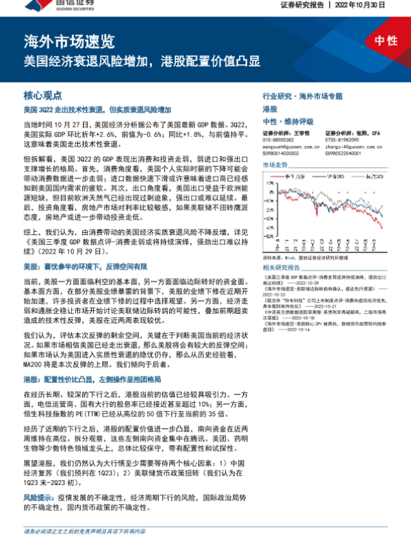 【国信证券】【20221030】海外市场速览:美国经济衰退风险增加,港股配置价值凸显-15页