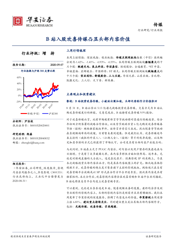 【华安证券】【20200907】20200907-华安证券-传媒行业周报:B站入股欢喜传媒凸显头部内容价值-17页