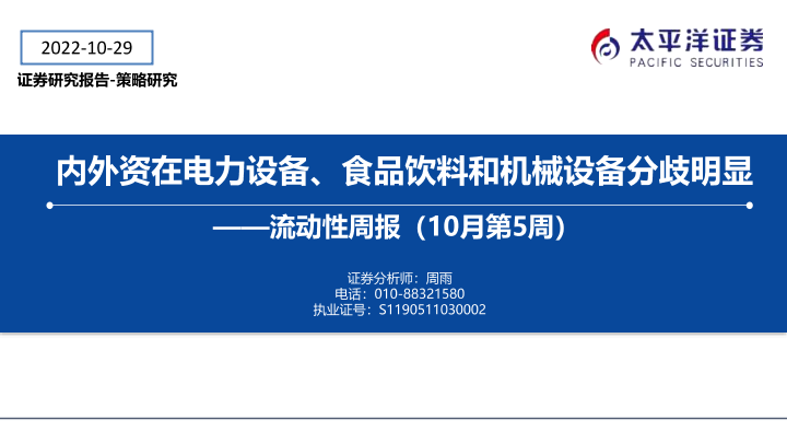 【太平洋证券】【20221029】流动性周报(10月第5周):内外资在电力设备、食品饮料和机械设备分歧明显-19页