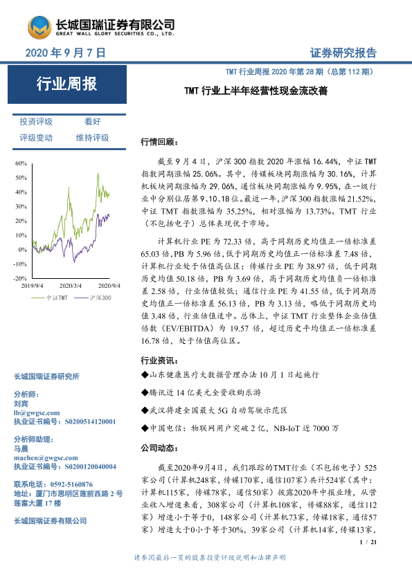 【长城国瑞证券】【20200907】TMT行业周报2020年第28期(总第112期):TMT行业上半年经营性现金流改善-21页