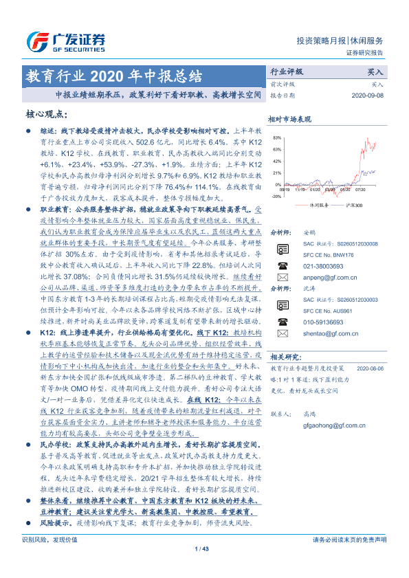 【广发证券】【20200908】教育行业2020年中报总结:中报业绩短期承压,政策利好下看好职教、高教增长空间-43页