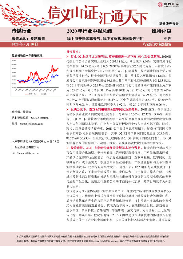 【山西证券】【20200910】传媒行业2020年行业中报总结:线上消费持续高景气,线下文娱板块回暖进行时-36页