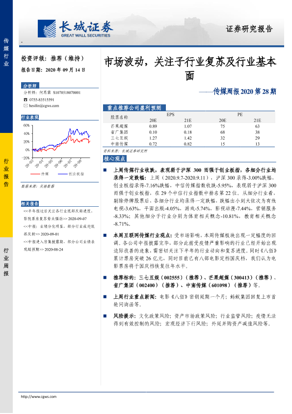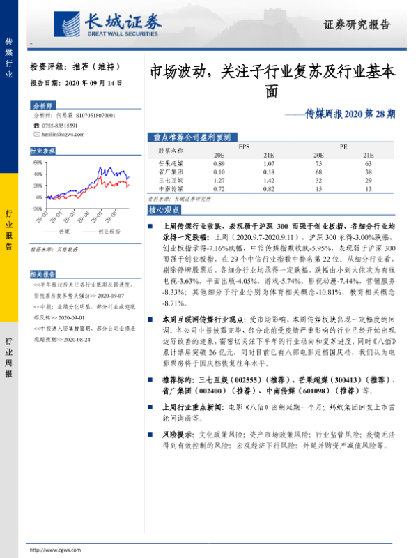 【长城证券】【20200914】传媒周报2020第28期:市场波动,关注子行业复苏及行业基本面-12页