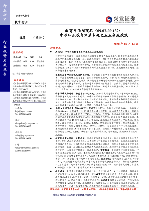 【兴业证券】【20200914】教育行业周随笔(09.07-09.13): 中等职业教育体系专题之五五分流政策-19页