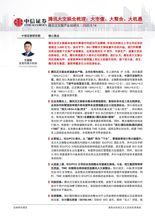 【中信证券】【20200914】腾讯大文娱全梳理:大市值、大整合、大机遇-41页