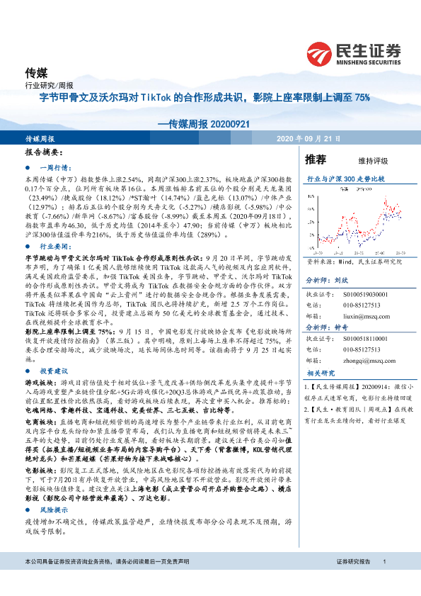 【民生证券】【20200921】20200921-民生证券-传媒行业周报:字节甲骨文及沃尔玛对TikTok的合作形成共识,影院上座率限制上调至75%-19页