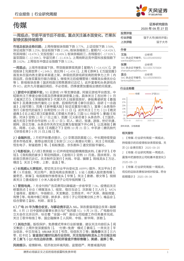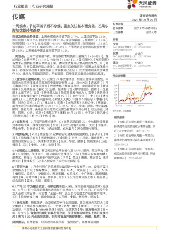【天风证券】【20200927】传媒一周观点:节前平淡节后不悲观,重点关注基本面变化,芒果东财绩优股持续推荐-22页