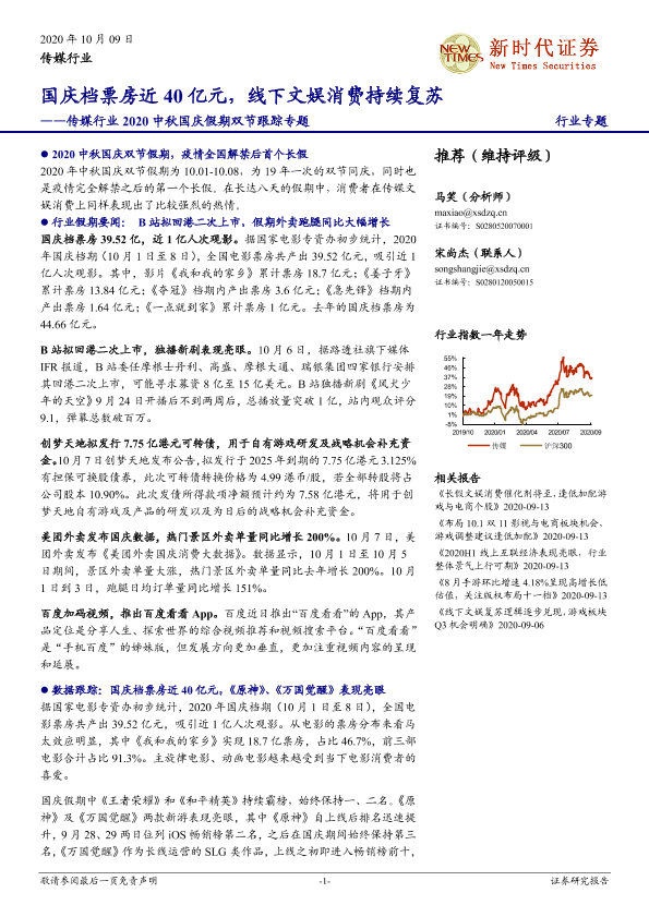 【新时代证券】【20201009】传媒行业2020中秋国庆假期双节跟踪专题:国庆档票房近40亿元,线下文娱消费持续复苏-11页