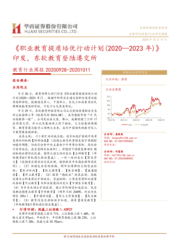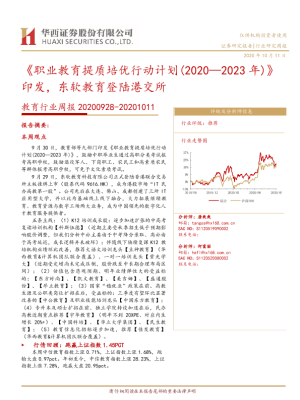 【华西证券】【20201011】20201011-华西证券-教育行业周报:《职业教育提质培优行动计划(2020—2023年)》印发,东软教育登陆港交所-16页