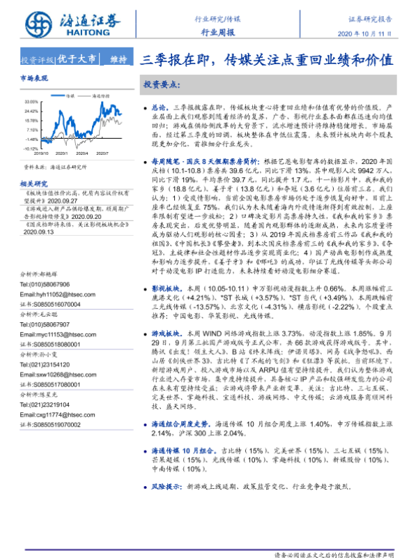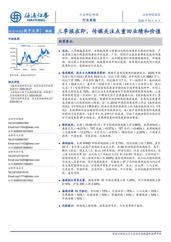 【海通证券】【20201011】20201011-海通证券-传媒行业周报:三季报在即,传媒关注点重回业绩和价值-10页