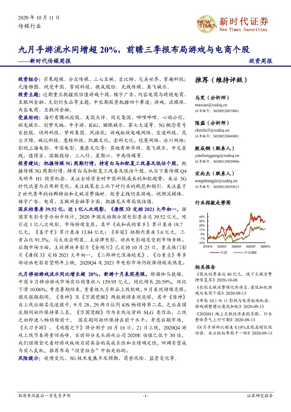 【新时代证券】【20201011】新时代传媒周报:九月手游流水同增超20%,前瞻三季报布局游戏与电商个股-32页