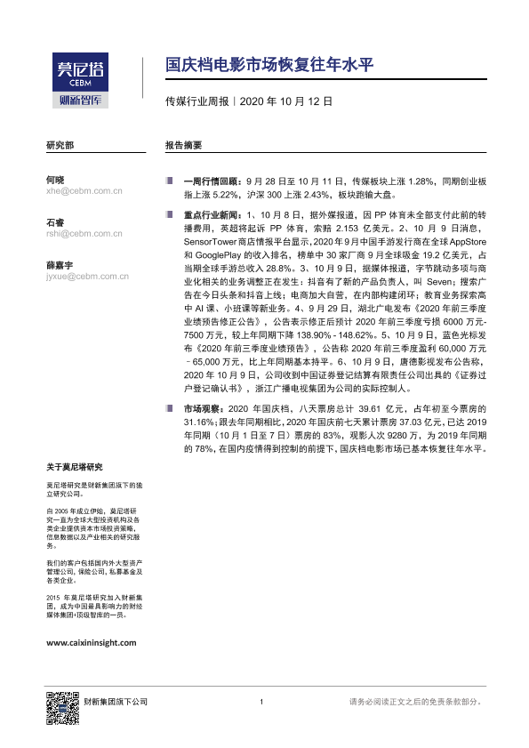 【莫尼塔研究】【20201012】20201012-莫尼塔投资-传媒行业周报:国庆档电影市场恢复往年水平-11页