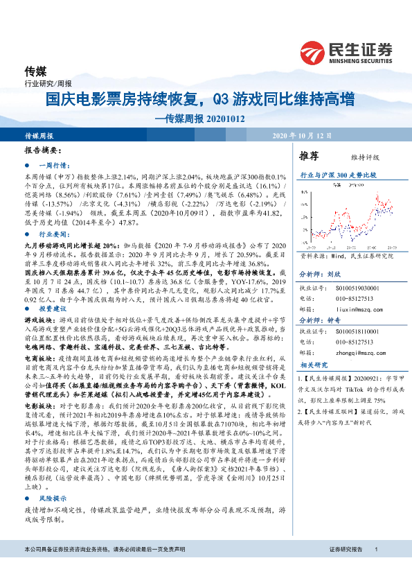 【民生证券】【20201012】国庆电影票房持续恢复,Q3游戏同比维持高增—传媒周报 20201012-17页