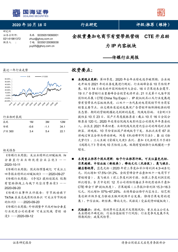 【国海证券】【20201018】20201018-国海证券-传媒行业周报:金投赏叠加电商节有望带热营销 CTE开启助力IP内容板块-19页