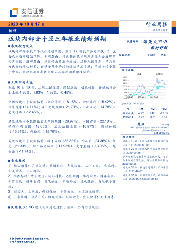 【安信证券】【20201017】传媒行业周报:板块内部分个股三季报业绩超预期-15页